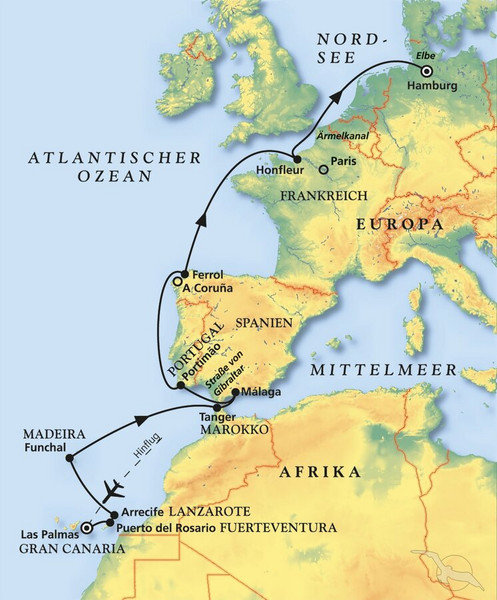 Im Frühling über Pfingsten nimmt MS Amadea Kurs auf neuer Route von Gran Canaria bis an die Nordsee. Genussvolle Tage mit wunderbaren Borderlebnissen und interessanten Landgängen erwarten Sie. In Las Palmas werden Sie vom Amadea-Team begrüßt, tags darauf liegt Ihnen die sonnenverwöhnte Strandinsel Fuerteventura zu Füßen, gefolgt von der rot gefärbten Vulkan-Szenerie Lanzarotes. Völlig anders präsentiert sich die saftig grüne Gebirgsinsel Madeira. Ein Traum für alle Botanik-Fans und weil es hier so besonders schön ist, bieten wir Ihnen auch gleich einen langen Aufenthalt mit Übernachtung in Funchal. Der folgende Seetag ist gespickt mit tollem Bordprogramm, bevor Sie Marokkos historischen Hafen von Tanger direkt an der Straße von Gibraltar erleben. In den Altstadtgassen fühlt man den Hauch des Orients. Málaga, die leuchtende Stadt an der Costa del Sol, ist nur einen Katzensprung entfernt.