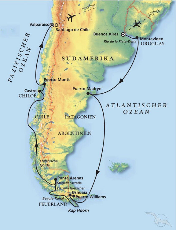 vorgesehen sind Passagen am Kap Hoorn, im Beagle-Kanal und am Darwin Gletscher | - | - | |