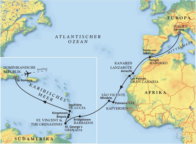 Kommen Sie mit zum großen Inselabenteuer an Bord von MS Amera. Unsere "Prinzessin" nimmt Sie mit zum verlängerten Sommerurlaub in die warmen Gefilde der Kanaren, Kapverden und Karibik. In Italien geht's los, um nach zwei schönen ersten Seetagen die Straße von Gibraltar und Marokko zu erreichen. Über Lanzarote und Gran Canaria kreuzen Sie weiter gen Süden zu den Kapverden. Nach ausgiebigen Landgängen auf den Inseln Sal und São Vicente geht es über "den großen Teich" zu den Antillen. Genussvolle und entspannte Bordtage steigern die Vorfreude auf das nächste "Land in Sicht". Im britisch geprägten Barbados beginnt Ihre Inselrunde, gefolgt von der Gewürzinsel Grenada, den Grenadinen und St. Lucia. Durch das karibische Meer erreichen Sie schließlich die Dominikanische Republik, von wo aus Sie die Heimreise antreten.