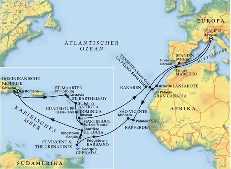 Sie sehnen sich nach einer Sommerverlängerung und möchten dem heimischen Herbst entfliehen? Dann kommen Sie doch mit auf unsere neu aufgelegte Reise mit MS Amera in die Karibik. Aus dem Mittelmeer heraus steuert Ihr Kapitän zahlreiche Ziele und Inseln dies- und jenseits des Atlantiks an. Sie alle verbindet ein wunderbar mildes bis hin zu warmes Klima und sonnige Stunden - Genussmomente. Über die Kanaren kreuzen Sie zu den Kapverden und überqueren von hier aus den "großen Teich". In Barbados geht der karibische Inselreigen los, gefolgt von Grenada, den Grenadinen und St. Lucia, bevor Sie in die Dominikanische Republik gelangen. Von hier aus nimmt Amera Kurs auf die nördlichen Kleinen Antillen wie St. Maarten, St. Barth, Antigua, Guadeloupe und Martinique. Dominicas saftig grüner Insel-Urwald dürfte Ihnen als letzter Eindruck noch lange in Erinnerung bleiben, und die Atlantiküberquerung bietet beste Gelegenheit, die vielen schönen Ziele der letzten Tage Revue passieren zu lassen. Über La Palma und Teneriffa kreuzen Sie nach Málaga, um zwei Tage später die Reise in Italien zu beschließen.
