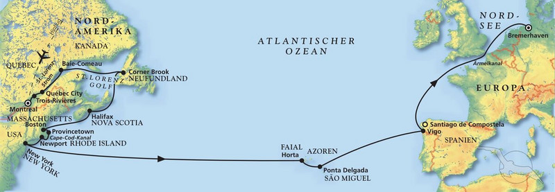 Montreal erwartet Sie die Crew mit einem herzlichen Hallo an Bord Ihrer Amera zu dieser Traumkreuzfahrt entlang der amerikanischen Ostküste durch den Sankt-Lorenz-Strom bis hin zur Freiheitsstatue am "Big Apple". Mit unvergesslichen Impressionen im Reisegepäck kreuzen Sie komfortabel genussvoll über den Atlantik zu den portugiesischen Inselvorboten im Atlantik hin zum diesmaligen Ende der Amera Kreuzfahrt in Bremerhaven.