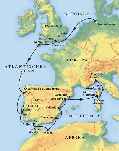 Kommen Sie an Bord von MS Amera zu dieser Oktoberkreuzfahrt Richtung Sonne. Über die Palmengesäumten Ufer Südenglands kreuzen Sie mit Ihrem persönlichen Traumschiff Richtung Nordspanien und weiter zu Portugals Hauptstadt Lissabon. Entlang der spanischen Küste haben wir ein Potpourri schönster Ziele für Sie ausgewählt, bevor die Perlen Korsika und Elba in Sicht kommen. In Savona heißt es dann für dieses Mal Abschied nehmen von MS Amera.