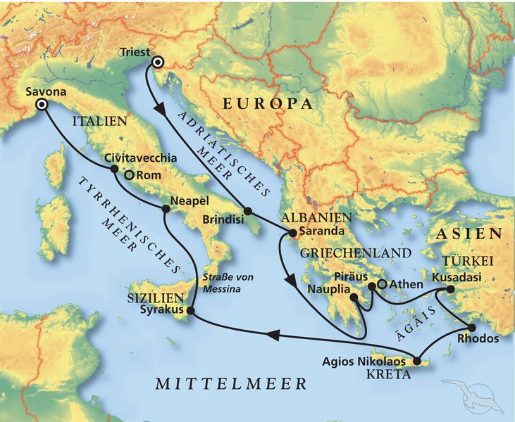 - Kurs auf Apulien, Albanien und Athens Akropolis