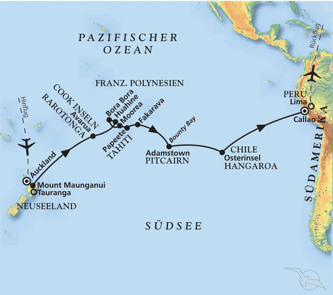 25 Tage pures Kreuzfahrtvergnügen mit Ihrer MS Amera liegen vor Ihnen, wenn Sie im neuseeländischen Auckland an Bord gehen. Nach der Überquerung der Datumsgrenze kreuzen Sie mit Ihrem persönlichen Lieblingsschiff zu den Cook Inseln und in die faszinierende Polynesische Inselwelt, ehe Sie in gemütlich komfortablen Seestunden Richtung Südamerika reisen, wo es in Lima dieses Mal Abschied nehmen von MS Amera heißt.