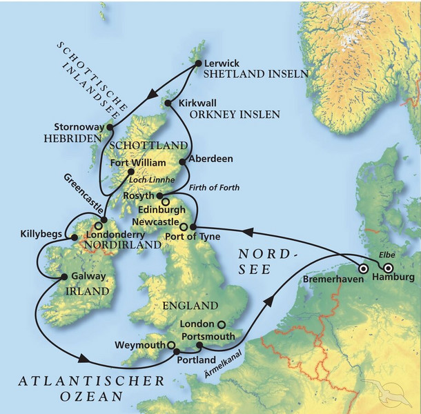 Schottland und Irland. Geschichtsträchtige schottische Städte wie Edinburgh und Aberdeen besuchen Sie ebenso wie die wettergegerbten Inselschönheiten Orkney, Shetland und Hebriden, ehe Sie entlang der irischen Küste zum palmengesäumten Süden Englands kreuzen. Wir wünschen viel Vergnügen!