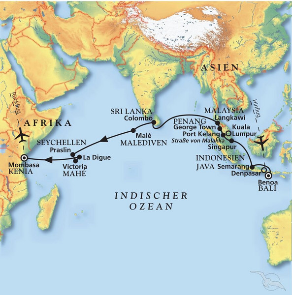 26 traumhafte Kreuzfahrttage liegen vor Ihnen, wenn Sie auf Bali an Bord Ihrer MS Artania gehen. Ostwärts kreuzt Ihr Lieblingsschiff Richtung Singapur und Malaysia, nach Sri Lanka und zu den Malediven, ehe Sie mit MS Artania die Trauminseln der Seychellen und das diesmalige Ziel der Reise, Kenia, erreichen. So abwechslungsreich wie die angesteuerten Ziele ist auch das Leben an Bord. Ruhig und spannend, musikalisch und besinnlich - es liegt