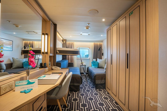 Diese 3-Bett-Kabinen mit Fenster (nicht zu öffnen) liegen außen auf dem Promenaden-Deck und verfügen über 2 untere Betten (auf Wunsch zusammenstelbar) und zusätzlich ein einklappbares Oberbett.