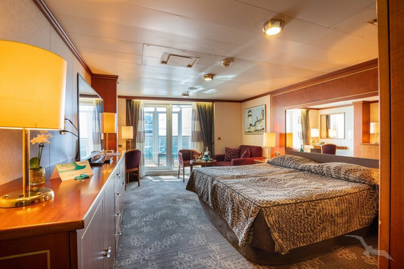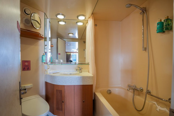 Es gibt eine separate Sitzgelegenheit (ausziehbar zu zwei zusätzlichen Betten) mit Tisch, 2 große Kleiderschränke, Spiegelkommode mit mehreren Schubfächern, Bad/WC, Bidet, Bademantel, Fön, SAT-TV (Empfang abhängig vom Fahrgebiet), Klimaanlage, Telefon, Safe, Minibar, WLAN (nicht inkl., Empfang abhängig vom Fahrgebiet).
