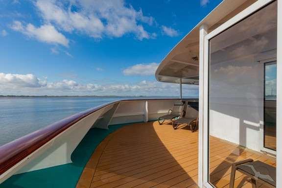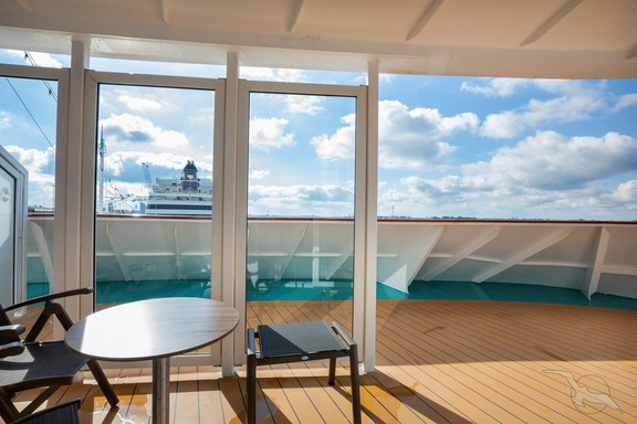 Großzügiger Balkon mit Sitzgelegenheit, Liegestühlen und Windschutz. Das große Fenster mit Schiebetür wird aus Sicherheitsgründen bei schwerem Sturm von außen mit Sturm-Läden verschlossen, da die Kabinen vorne gelegen sind. Bei Dunkelheit müssen die Vorhänge von Tür und Fenster geschlossen werden.