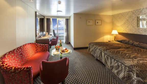 Diese 2-Bett-Spa-Junior-Suiten liegen unmittelbar am Spa und Wellnessbereich außen auf dem Panorama-Deck. Der große Privat-Balkon ist mit einem beheizbaren Whirlpool ausgestattet. Es gibt 2 Betten, die je nach Wunsch getrennt aufgestellt werden können, separates Sofa mit Tisch und Sessel, 2 Doppelschränke, Spiegelkommode mit mehreren Schubfächern, DU/WC, Bademantel, Fön, SAT-TV (Empfang abhängig vom Fahrgebiet), individuell regulierbare Klimaanlage, Telefon, Safe, Kaffee-Maschine, Minibar (mit Getränkeauswahl inklusive), WLAN (3 GB Internetzugang frei je Reiseabschnitt, Empfang abhängig vom Fahrgebiet).