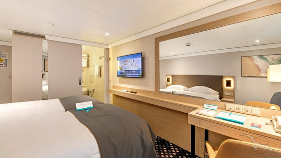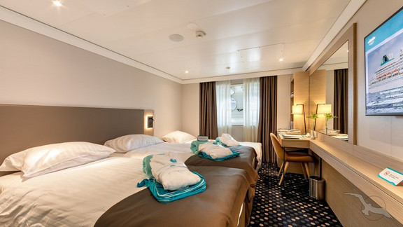 Diese 3-Bett-Kabinen mit Bullaugen (nicht zu öffnen) sind mit 2 unteren Betten (wahlweise zusammen o. getrennt stellbar) sowie einem Sofabett ausgestattet, mit begehbarem Kleiderschrank, Spiegelkommode mit mehreren Schubfächern und Stuhl, DU/WC ausgestattet.