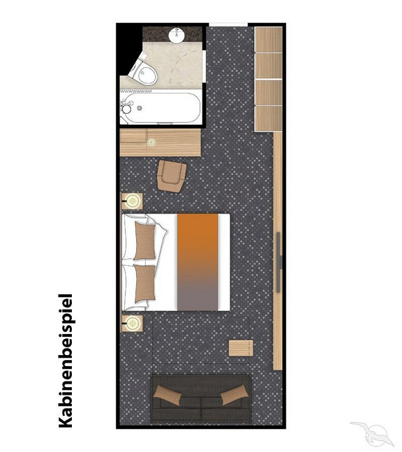 Die Innenkabinen verfügen über 2 untere Betten (wahlweise zusammen o. getrennt stellbar). Es gibt ein bis zwei große Schränke, Spiegelkommode mit mehreren Schubfächern und Stuhl, kleines Sofa, Bad/WC. Die Kabinen 807 und 828 sind behindertenfreundlich und mit DU/WC ausgestattet.