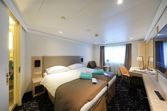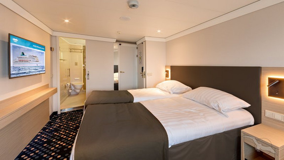 Diese 2-Bett-Kabinen mit Fenster (nicht zu öffnen) verfügen über 2 untere Betten (wahlweise zusammen o. getrennt stellbar). Die Kabinen sind mit einem begehbaren Kleiderschrank, Spiegelkommode mit mehreren Schubfächern und Stuhl, Sessel, Bad o. DU/WC ausgestattet. Sichtbehinderung.