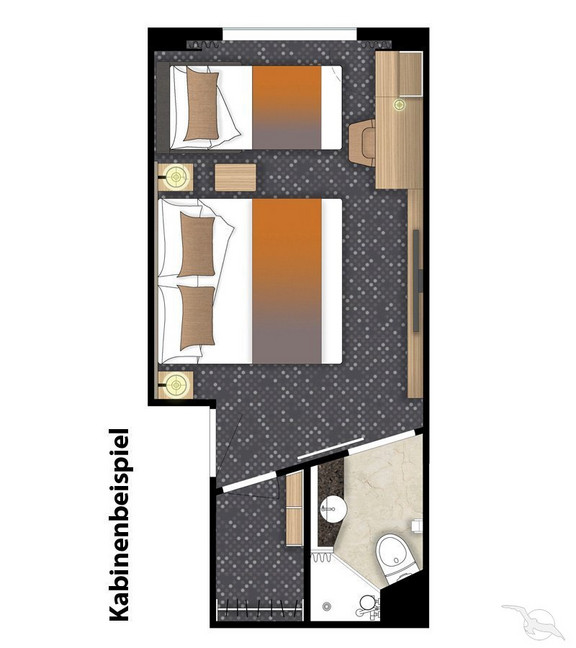 SAT-TV (Empfang abhängig vom Fahrgebiet), individuell regulierbare Klimaanlage, Telefon, Minibar, Safe, Fön, Schminkspiegel.