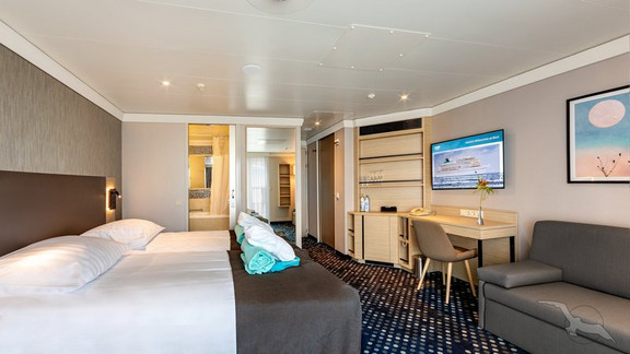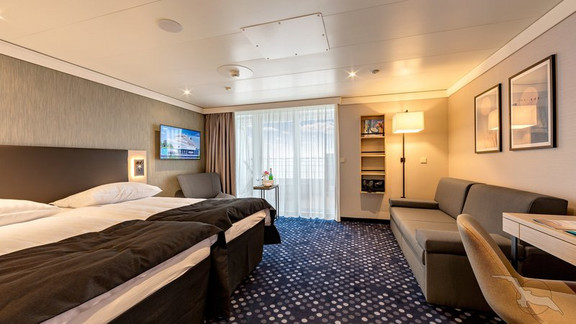 Die 2-Bett-Junior-Suiten mit Schiebetür zum Privat-Balkon (2 Stühle u. 1 Tisch) sind elegant ausgestattet, mit 2 unteren Betten (auf Wunsch trennbar) und einem Sofa. Die Kabinen verfügen über einen begehbaren Kleiderschrank, Tisch und zwei Stühle, Kommode mit mehreren Schubfächern, Bad/WC. Die Kabinen 1016 und 1019 sind behindertenfreundlich und mit DU/WC ausgestattet.