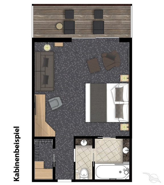 Die 2-Bett-Junior-Suiten mit Schiebetür zum Privat-Balkon (2 Stühle u. 1 Tisch) sind elegant ausgestattet, mit 2 unteren Betten (auf Wunsch trennbar) und einem separaten Sofa (als zusätzliches Schlafsofa nutzbar). Die Kabinen verfügen über einen begehbaren Kleiderschrank, Tisch und zwei Stühle, Kommode mit mehreren Schubfächern, Bad/WC.