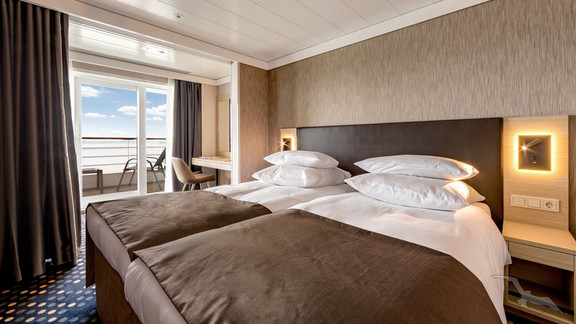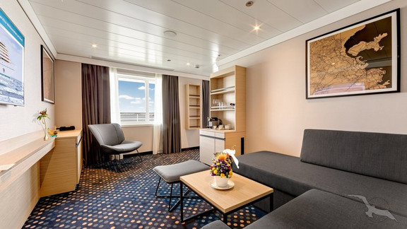 Diese 2-Bett-Suiten mit Schiebetür zum Privat-Balkon (2 Stühle u. 1 Tisch) sind mit 2 unteren Betten (auf Wunsch trennbar) und einem separaten Schlafsofa ausgestattet. Ein begehbarer Kleiderschrank, Tisch mit Stuhl, großer Spiegel, eine Wohnwand mit mehreren Schubfächern, Badewanne und ein separates WC stehen Ihnen zur Verfügung. Der Wohn- und Schlafbereich kann mit einem Vorhang getrennt werden.
