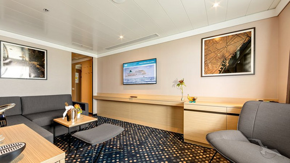Diese 2-Bett-Suiten mit Schiebetür zum Privat-Balkon (2 Stühle u. 1 Tisch) sind mit 2 unteren Betten (auf Wunsch trennbar) und einem separaten Schlafsofa ausgestattet. Ein begehbarer Kleiderschrank, Tisch mit Stuhl, großer Spiegel, eine Wohnwand mit mehreren Schubfächern, Badewanne und ein separates WC stehen Ihnen zur Verfügung. Kabine 1203 verfügt über eine Dusche. Der Wohn- und Schlafbereich kann mit einem Vorhang getrennt werden.