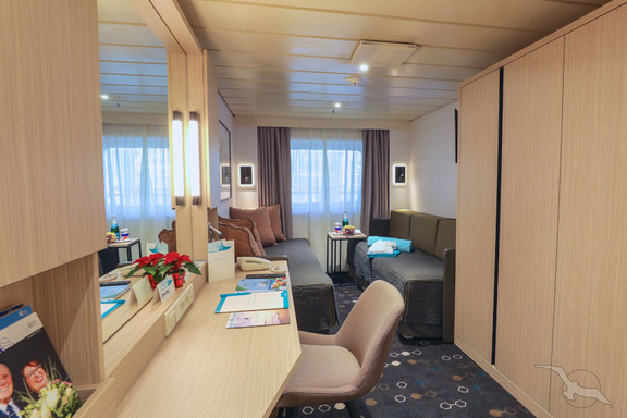 Es gibt 2 große Schränke, Spiegelkommode mit mehreren Schubfächern, Stuhl, Dusche/WC, Bademantel, Fön, SAT-TV (Empfang abhängig vom Fahrgebiet), individuell regulierbare Klimaanlage, Telefon, Minibar, Safe, (WLAN nicht inkl., Empfang abhängig vom Fahrgebiet).